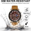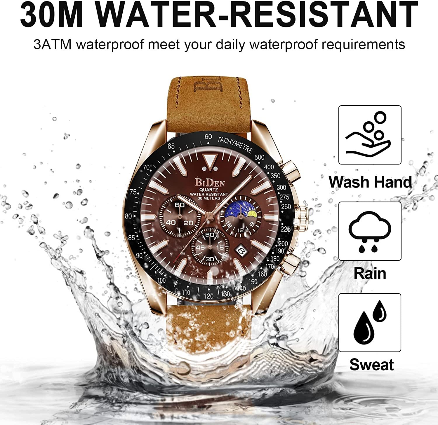 3ATM Daily Waterproof – This leather band watch for men is 30m waterproof, can withstand daily splash, but not swimming and showering, diving or snorkeling. It is a multifunction watch with stopwatch, date calendar and luminous hands in the dark.