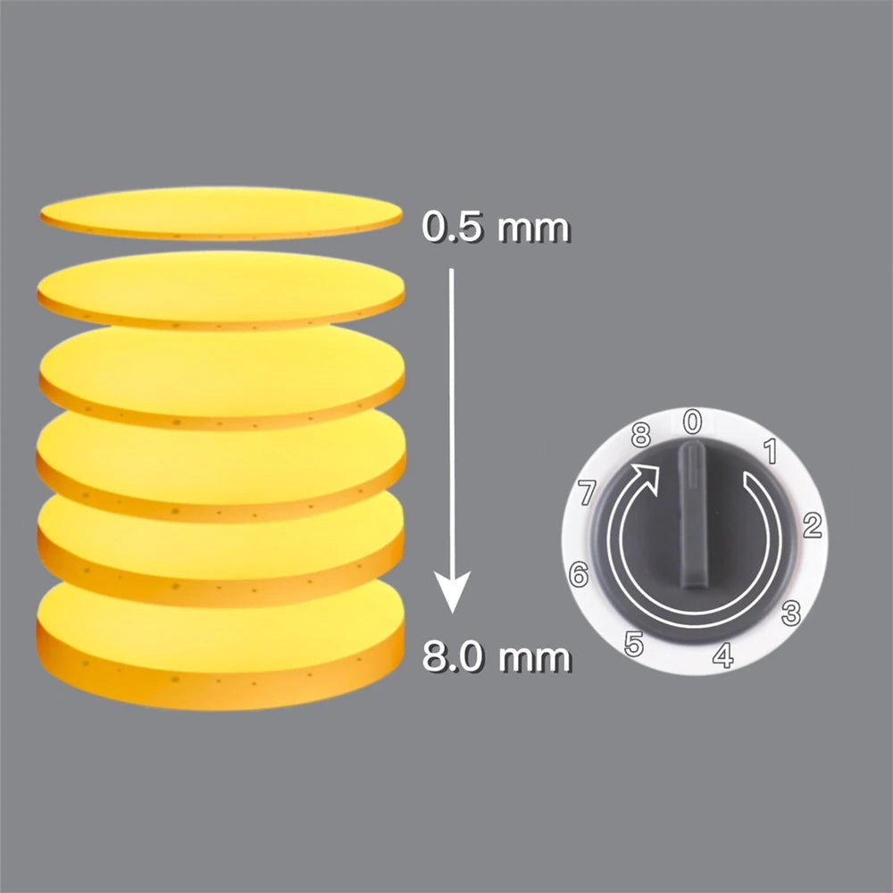 • Eight thickness levels: slices, dices, juliennes, and fry cuts